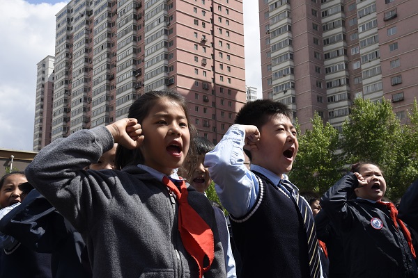 国旗在大家注目中冉冉升起。四位小升旗手合着激昂的义勇军进行曲,分秒不差地将鲜红的国旗升至旗杆顶端。