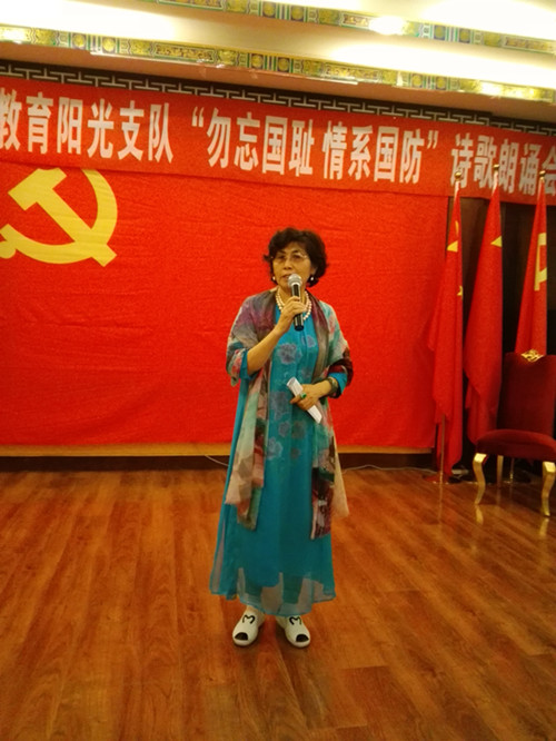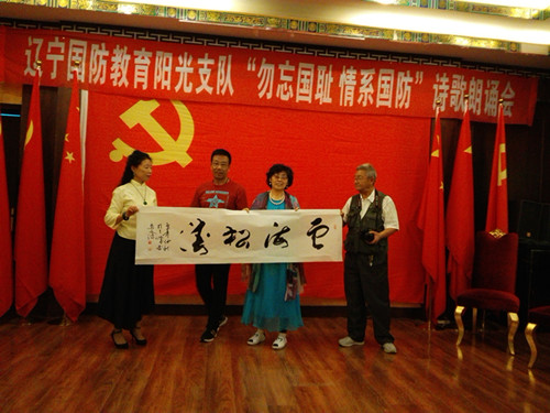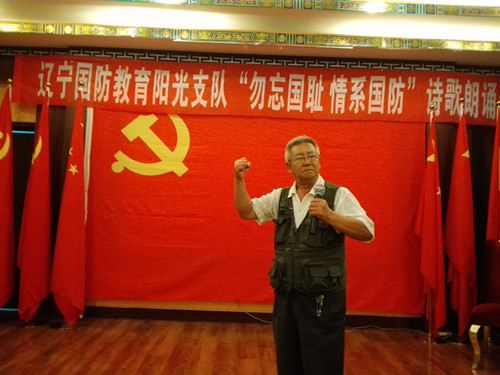 “九一八”事变纪念日之际,“勿忘国耻,情系国防”诗歌朗诵会在沈阳古玩城举办,来自各条战线的百名辽宁国防教育阳光支队人士联袂朗诵,其中年龄最大者74岁。