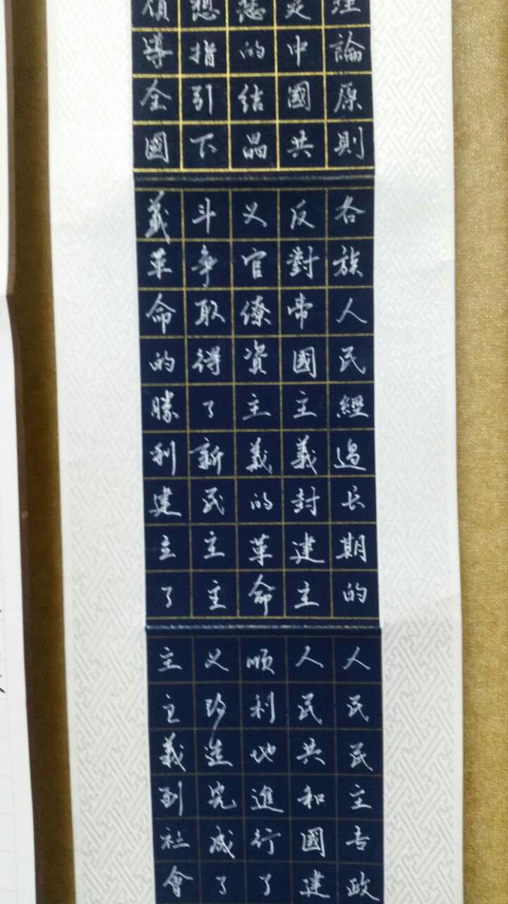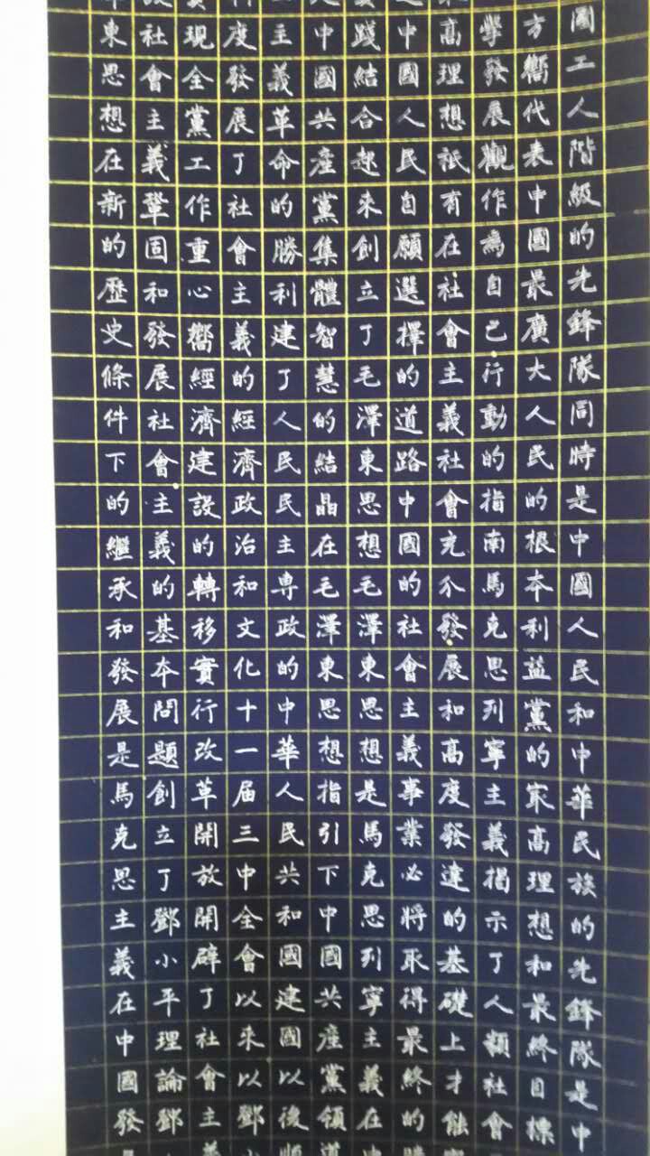 除专业组作品外,业余组的作品也不乏力作。最使我感动的是八十五岁抗美援朝老战士马世勋全文抄录的一万八千字的党章和李维波老首长热心组织干休所老干部敬录党章,并三番五次到我会送抄录件的感人景象。