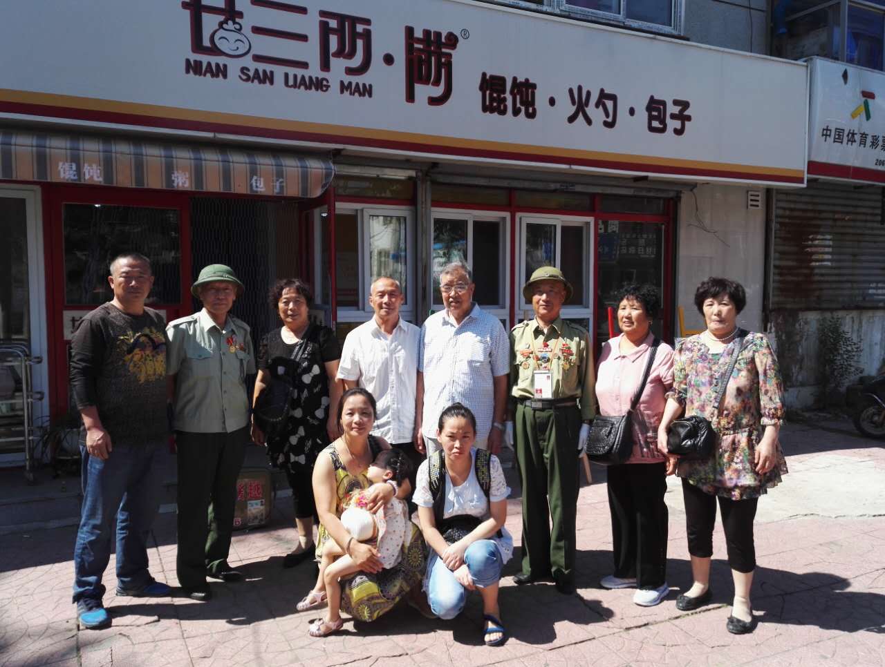 我们下了车走进站前广场,一眼就看到了二位身着十分显眼的军装,头上戴着越南式军帽的我三舅的生前战友:张玉忱和陈祥君同志。顿时使我们感到十分的亲切。其中的一位胸前几乎戴满纪念章并偑有一条上面绣着《辽宁省国防教育基金会》彩带的舅舅主动上前来同我们握手,并且自我绍:“我叫张玉忱,是当年你们的亲人张连昌同志的同连战友;这位是当年的铁道兵援越抗美战友陈祥君同志。欢迎大家的到来!咱们大家先在沈阳站前广场合上一个影,然后咱们抓紧找到246公交车到老指导员家去聚齐。
