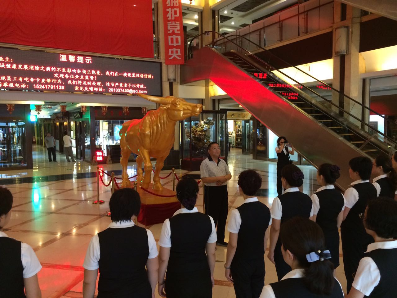 下午时分,原沈阳军区金华园宾馆的同志们身着白衣蓝裤制服,迈着轻盈整齐的步伐,来到沈阳古玩城,参加由辽宁省国防教育基金会承办的党庆系列活动。