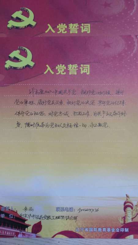 敬录者是我的小学同学朱晶,前几天和他聊天时,谈到辽宁省国防教育基金会开展“学党章、写党章 、增强党的意识”活动。他非常激动,马上说:"建党95周年就要到了,我是一名老党员,我老伴也是,我们也要积极参加这个活动,为党的生日献礼。"