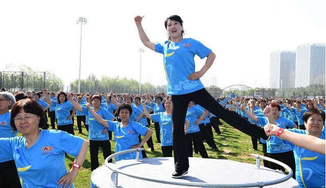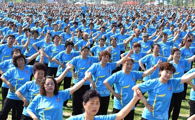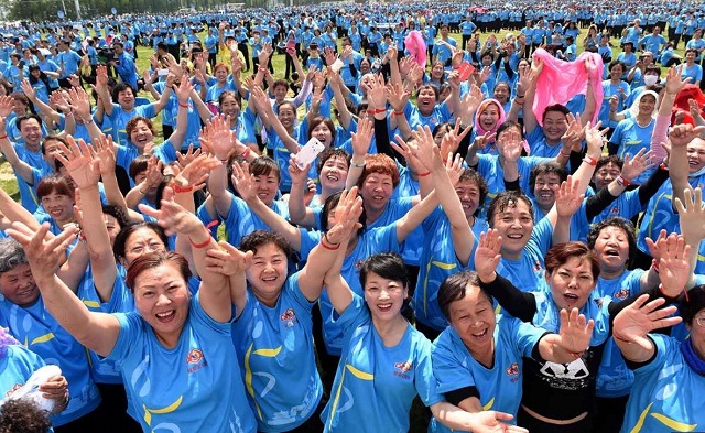 沈阳广场舞爱好者六千人齐聚此地,他们统一着海兰色衫、黑色裤,精神抖擞,队伍整齐、动作潇洒,浩浩荡荡,显得格外漂亮。远远望去,犹如大海的波涛,时隐时显,慰然壮观,场面极为震憾!