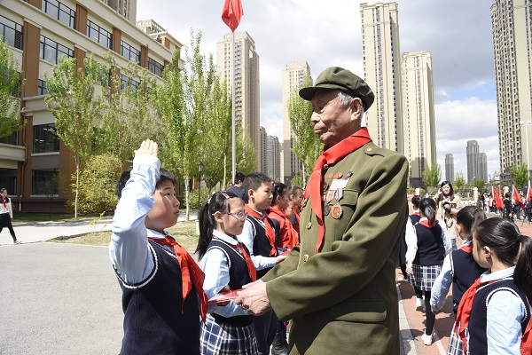 少先队员向来宾佩戴红领巾,让老英雄们兴奋不已。孩子们幼稚的队礼,老兵们庄严的军礼,令人难忘地交汇在一起,实现了历史性的传承。