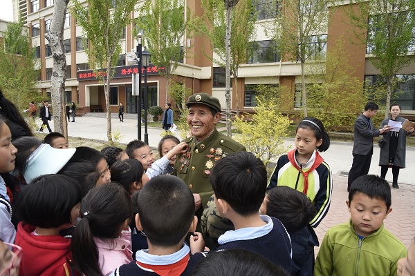 少先队员向来宾佩戴红领巾,让老英雄们兴奋不已。孩子们幼稚的队礼,老兵们庄严的军礼,令人难忘地交汇在一起,实现了历史性的传承。