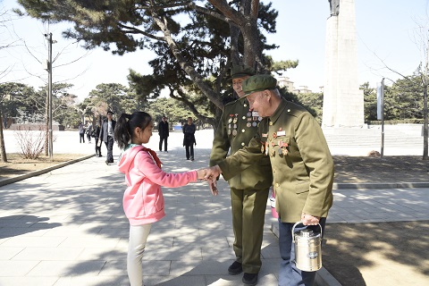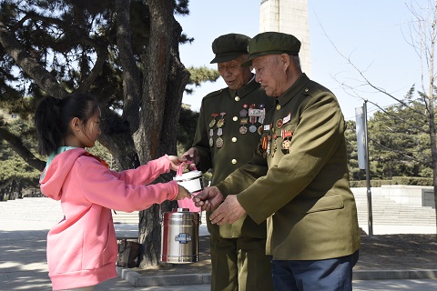 小姑娘娓娓道来:" 我是辽宁省国防教育基金会国防小记者,去年中秋节在去丹东给边防战士送月饼和参加"红色基因、中国心"活动中,听到关于爷爷们的事迹。最近,又从网上得知爷爷清明节又要到陵园义务讲解,中午只喝矿泉水,吃面包,太辛苦了! 我就产生了给爷爷送饭的想法。没什么,没什么。"