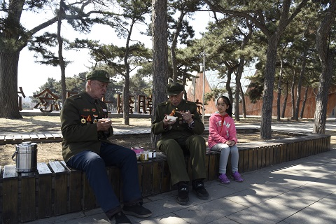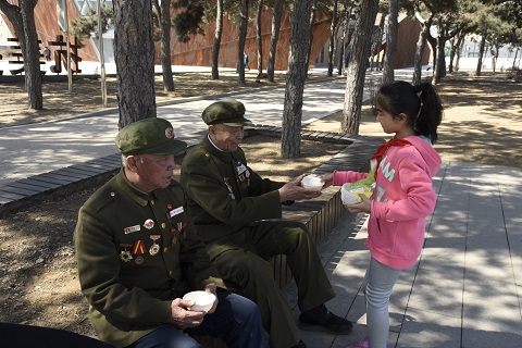 一个着粉红色衣服的小女孩提着保温桶,径直来到抗美援朝老兵李维波、马世勋面前。