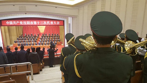11月15日,辽宁会堂,庄严而肃穆。 中国共产党沈阳市第13次代表大会正在这里召开。 震憾的军乐敲击着每个与会者的心扉。 激昂的《国际歌》声响彻庄严肃穆的会堂。 放眼望去,身着礼服,手握重器,军容严整,气度非凡的军乐团格外醒目。 侧耳倾听,每个音符是那样的准确、优美、激昂、雄壮! 真的,与中国人民解放军军乐团的演奏别无而致。 代表们激动、感动、冲动,自豪地唱响着时代的最强音,在军乐的催促声中肩 负起人民赋予的神圣使命。