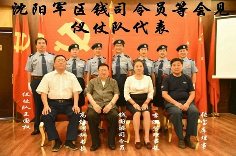 仲秋、沈阳,辽宁省国防教育基金会大会议室庄严肃穆,在鲜红的党旗前,原沈阳军区钱国梁上将和原辽宁省军区副司令员南启祥将军,在李淑芳、高建明等同志陪同下,会见了女子仪仗队代表。应王国权团长邀请,钱司令员亲自为仪仗队授予《辽宁省国防教育仪仗队》队旗。王国权向钱司令员和李淑芳理事长庄严地敬了军礼,并荣幸的接过队旗。