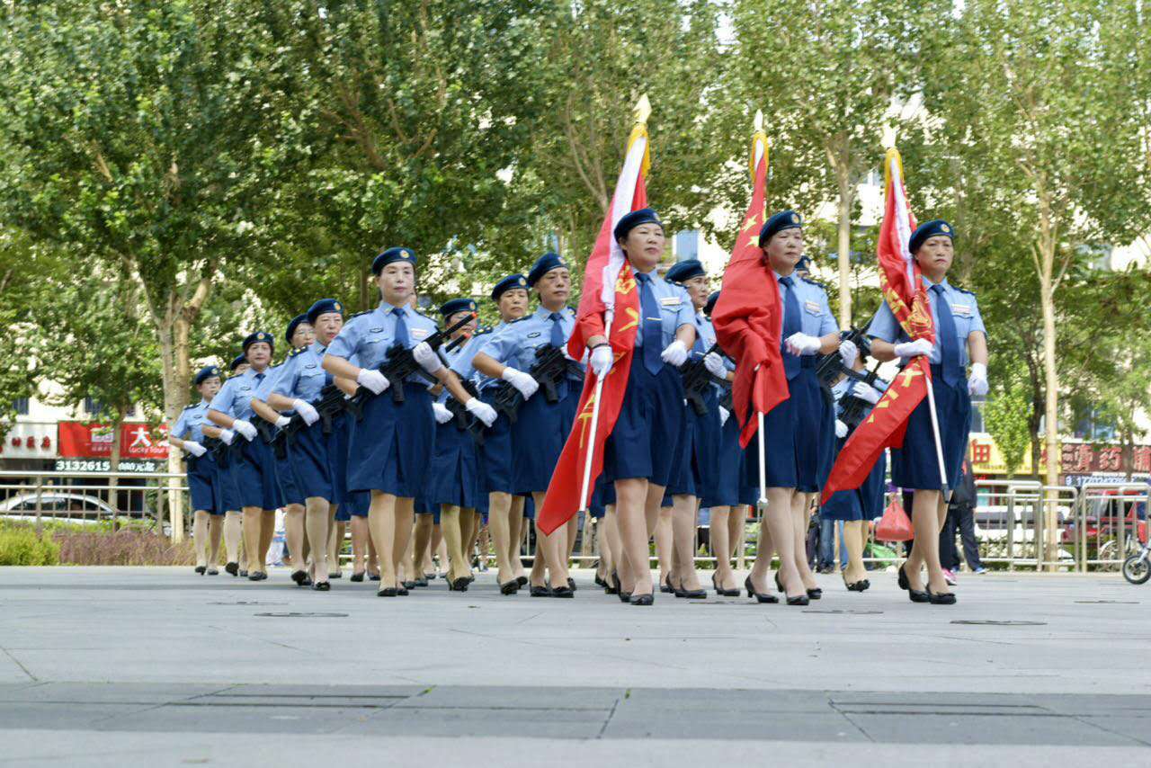 9月2日9时许,沈阳八一公园,着军礼服盛装的近40名女子仪仗队员在公园西大门集合。她们全员持枪在八一.军徽铜墙铁壁广场列队行进表演。