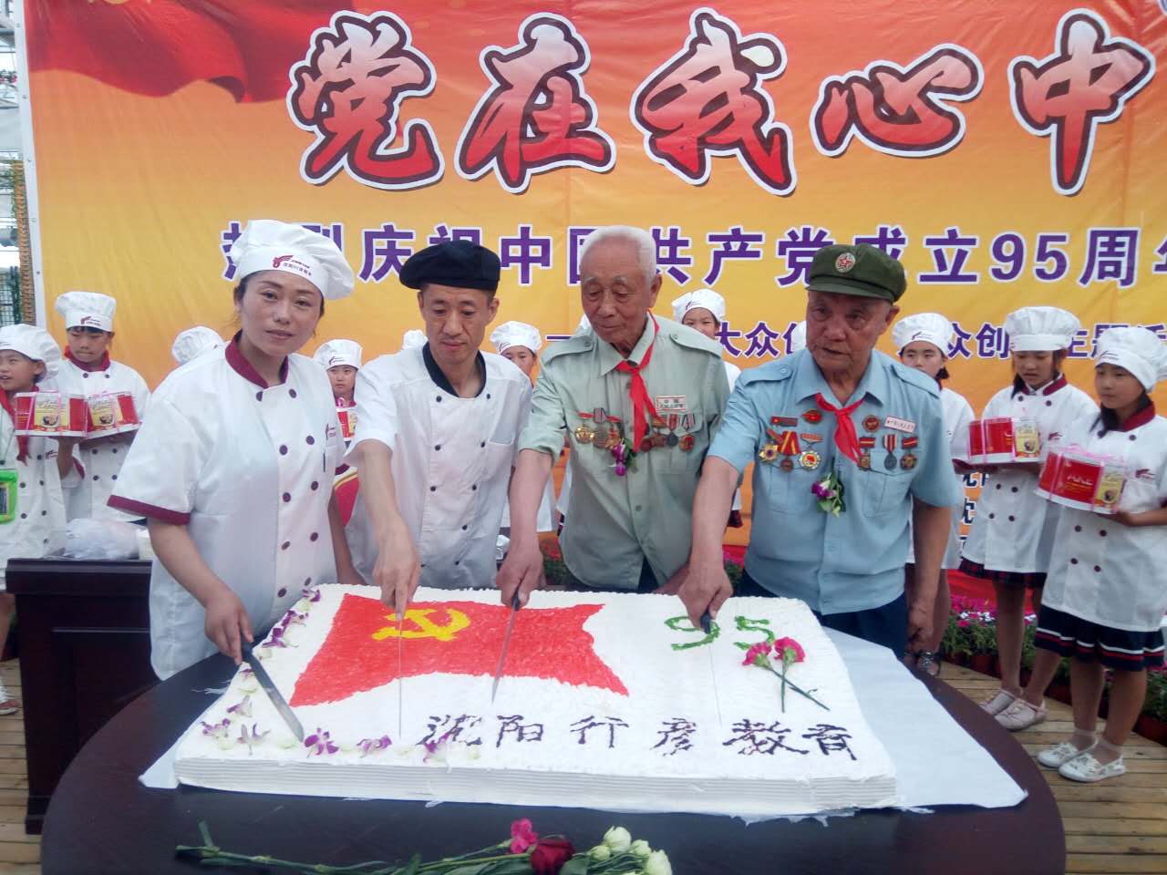 我会抗美援朝老战士李维波、马世勋为270学生进行了党史教育,讲述了他们在战场上的感人故事,并与西式面点专业学员共同制作了大型党恩蛋糕,同时小朋友们以爱党,爱国,爱家乡,放飞理想,爱我中华为主题,亲手制作了D I Y蛋糕,为党的95华诞增添了浓重的一笔。