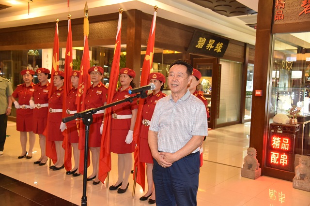 高建明秘书长担任活动主持。他首先汇报了近期工作情况。他说,昔日静肃的古玩城,近来来宾众多,热闹非凡,充满"党味",已成为辽宁省党建宣传教育工作的一道亮丽的风景线。71平方米的特制巨幅党旗引人注目,震憾人心。已成为社会各界向党致敬,祝贺九十五华诞的绝佳之地。