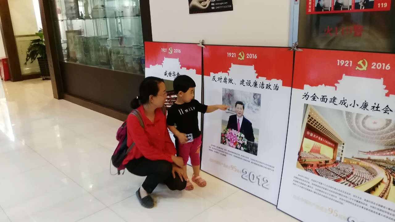 我被小娘俩感动了。忙上前询问,原来娃娃刚刚两岁。 我在想,党史教育如果从娃娃抓起,社会上还会有信仰危机吗? 让人惊讶的是,宝宝稚嫩的小手突然指着习主席的照片,叫着、喊着,"习爷爷"、"习爷爷"!